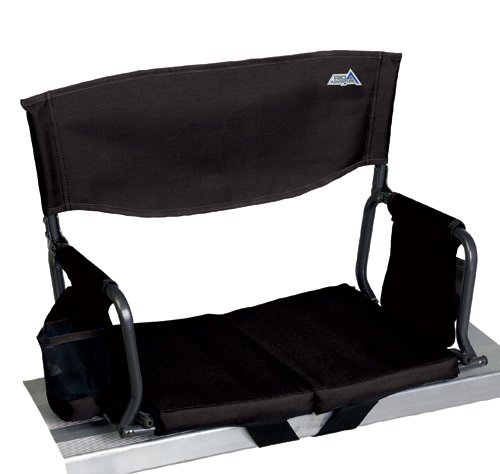 STADIUM ARM CHAIR- Sit at the game in comfort. A stadium seat designed with a wide and angled backrest to provide firm and comfortable back support. The compact design allows the Stadium Arm Chair to transport easily with its convenient shoulder strap. Folds and unfolds easily and attaches quickly to most bleachers with a click of a single buckle. Features a cushiony, wide padded seat, padded armrests, beverage holder and storage pockets. Supports up to 225 lb. (102 kg). Measures 20 x 15.5 x 12 in (50.8 x 39.4 x 30.5 cm) when open. Folds 12 x 10 x 4.5 in (30.5 x 25.4 x 11.4 cm). Available in navy blue, black and red. Ideal for watching sports and picnicking.