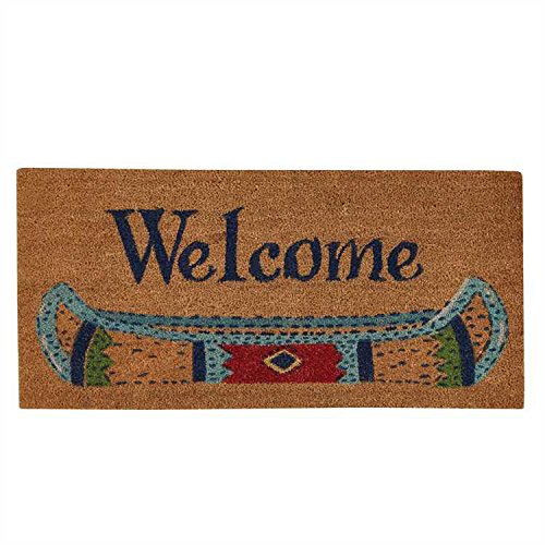 18W X 38L. Hand painted Canoe design and text. Colorfast dyes. Non toxic. Rug has durable bristles that absorb moisture and trap dirt. Mildew resistant. Skid resistant backing. 70% Coir, 30% vinyl Made for indoors or covered porch areas. Made...
