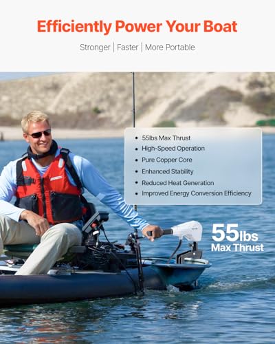 Click for More Images Powerful Thrust for Superior Performance: Our 12V manual trolling motor delivers 55lbs of thrust, providing exceptional power and efficiency for saltwater fishing. The high-quality motor structure ensures all-day operation...