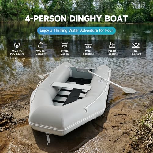 Click for More Images Built Tough for Any Adventure: This 10 ft inflatable boat by CO-Z is crafted from durable 1000 Denier PVC and reinforced with quadruple-overlap seams, providing exceptional strength and protection against wear, oxidation,...