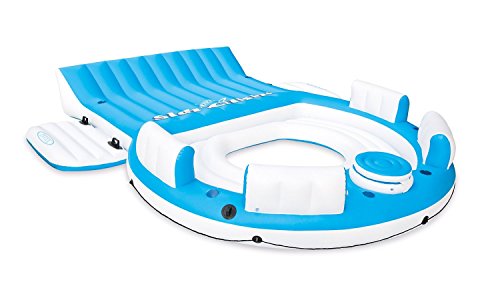 The Intex Relaxation Island is an inflatable water raft that can seat you and 5 of your friends for a great day out on the lake. There are 6 cup holders and a built-in cooler to keep drinks on hand for everyone. The center of the float DOES NOT...